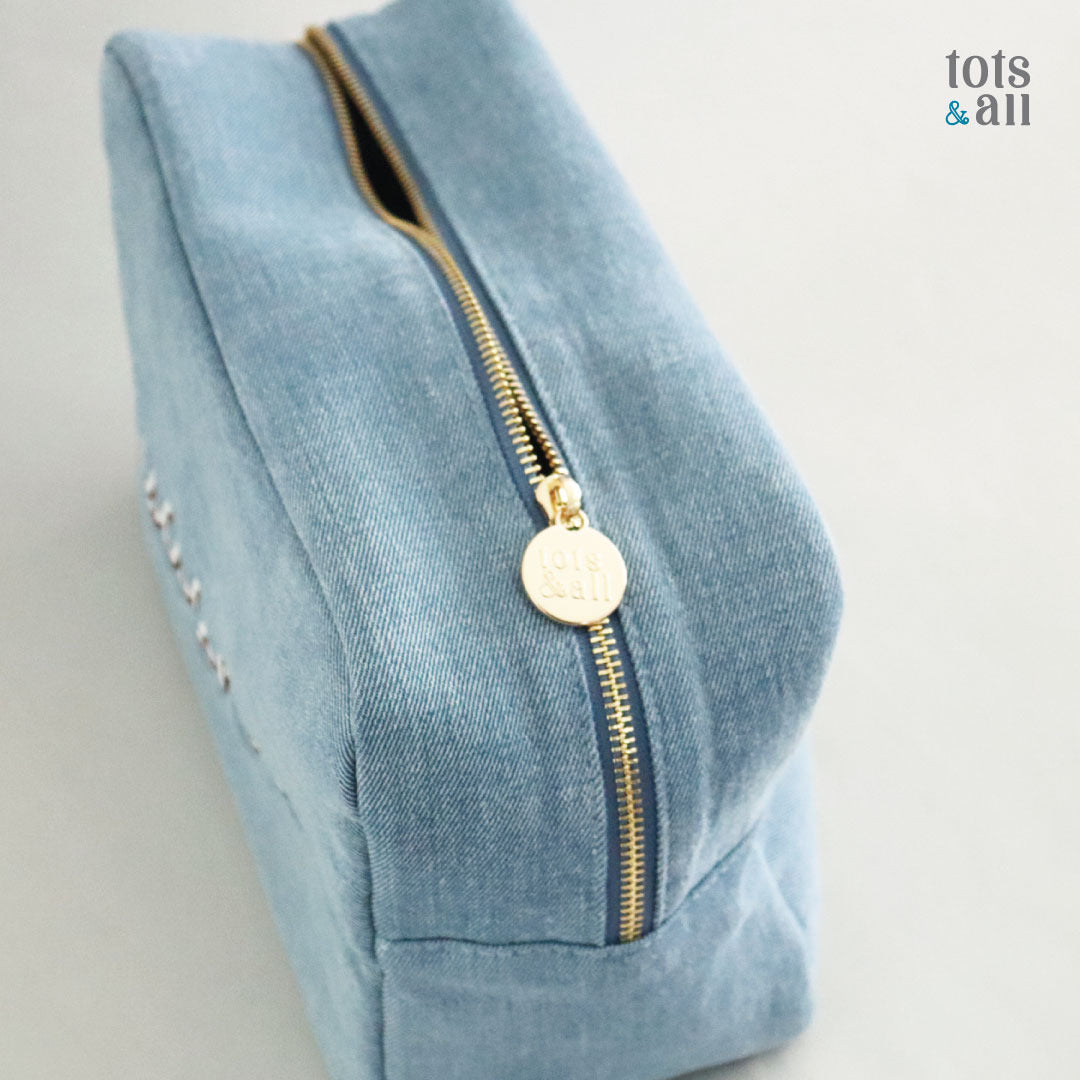 Say hello to our bigger, better, denim edition — a timeless twist on our beloved Tot Bag. Crafted in sturdy denim and finished with a gold Tots & All zipper, this bag is made for all ages and stages.
